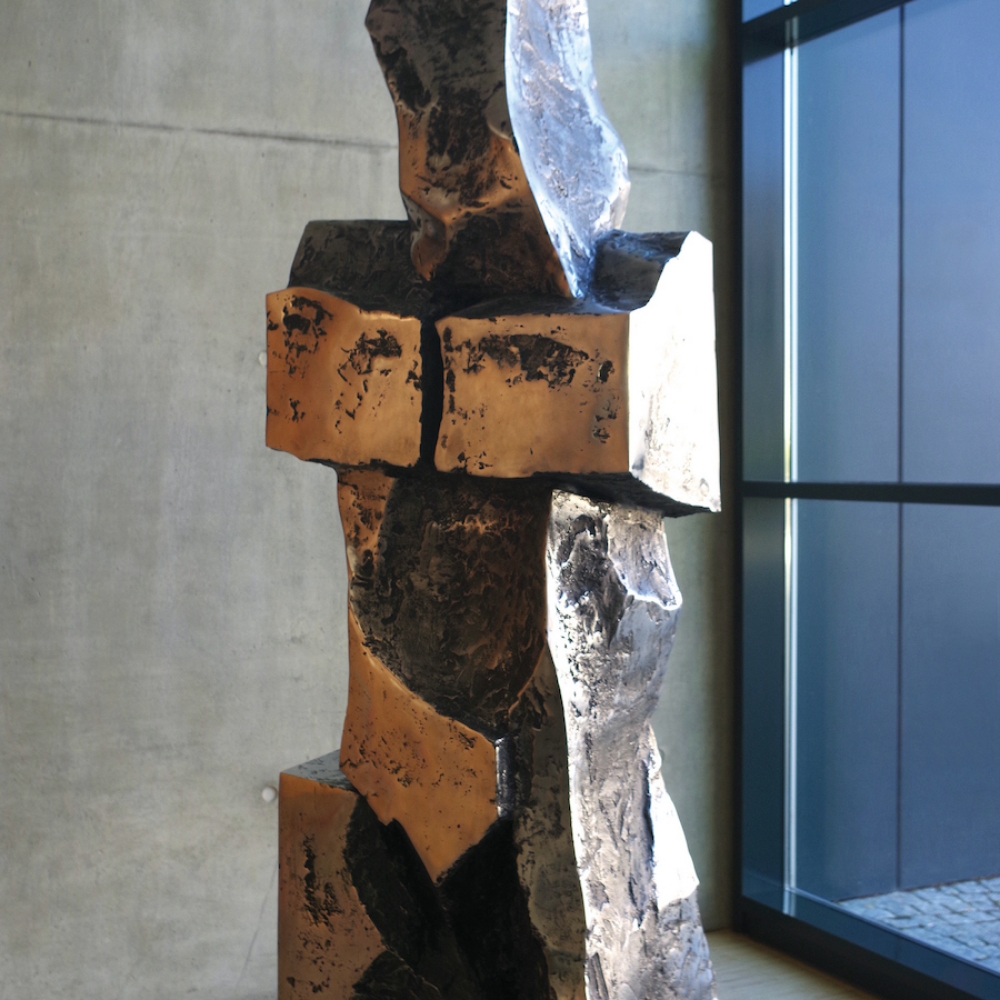 Die Oberflächen hat der Bildhauer Björnsgard, sowohl im Guss, wie in der Nachbearbeitung, sorgfältigst angelegt und bearbeitet. Polierte, hell aufleuchtende, glatte Flächen kontrastieren stark mit dunklen, raun, ausgeprägt durchfurchten Gefügen. Diese Kontraste führen die Fähigkeiten der Hand und der Werkzeuge des wachen Künstlers, aber auch die Möglichkeiten des Materials Aluminium vor Augen. Sie lassen Entwicklung und Offenheit, das Unabgeschlossene der Gestalt erkennen. Der fertige Guss, der massiv und auf Dauer angelegt dem Betrachter entgegentritt, verweist in seiner Gestalt auf eine letztlich unabschließbare Reihe von Möglichkeiten. (Text: Kunstmuseum Singen)
